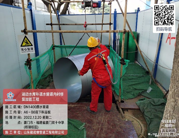 4.项目概况:湖边水库DN1400补调水管道全长8709.5m,起点为高殿水厂。湖边水库补调水管道设计输水能力20万m³/d,是保障厦门市岛内原水应急供应的重要管道。湖边水库补调水管道补调水管道自2010年1月投入运行,部分路段管道多次发生漏水或破管事件,因此本次对爆管频繁发生段管道予以修复。该现状管管径为DN1400,采用预应力II 级钢筋混凝土管(以下简称混凝土管)、钢管和球墨铸铁管埋地铺设,其中原管材为钢管或球墨铸铁的管段本次不予以修复。由于混凝土管段多次发生管道破裂、脱节及沉降事件,因此本次对混凝土管段予以修复,全长3568.55m。采用非开挖方式内衬不锈钢更新修复。