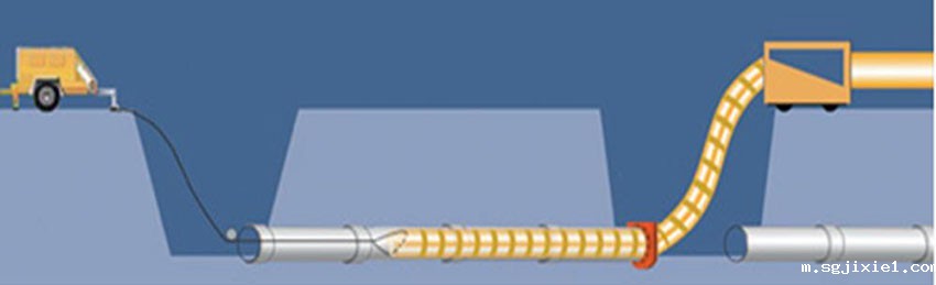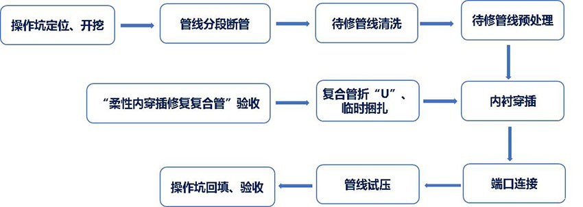 内衬复合软管的修复工艺是将外径等于或略小于旧管道内径的复合管,通过变形设备将柔性复合管轧成“U”型并暂时捆绑使其直径减小,通过牵引机将柔性复合管穿入旧管道,然后用水或压缩空气将其涨开恢复到原来的直径,使内衬管贴到旧管道的内壁上,形成合二为一的“管中管”复合结构。